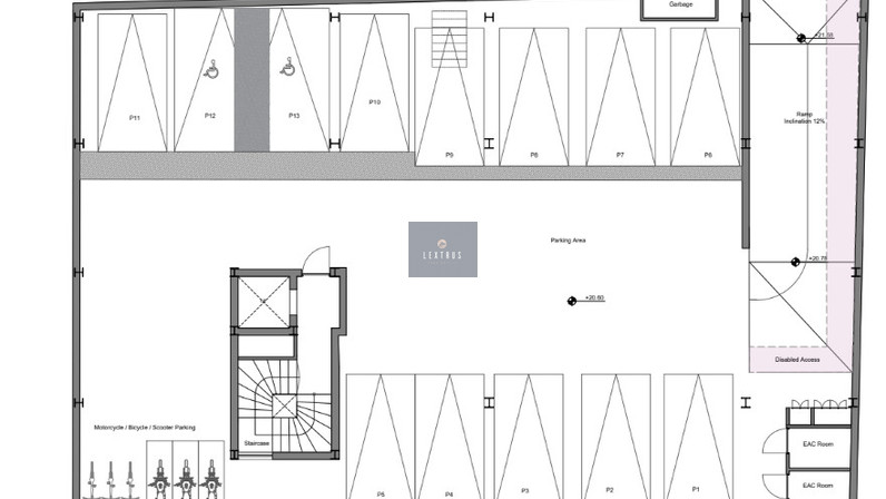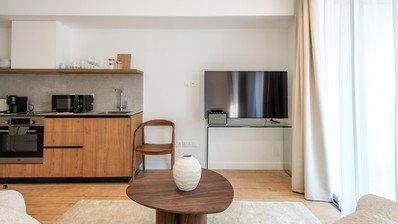 This modern studio apartment, exclusively listed by Lextrus Real Estate, is located on the second floor of a three-story building with elevator access.