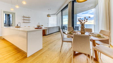 The apartment comes equipped with central air conditioning and underfloor heating. The kitchen and living spaces are stylishly furnished, reflecting a contemporary design ideal for modern city living. Residents benefit from a secured, gated complex with amenities such as a communal swimming pool , sauna , jacuzzi and a fully equipped gym.