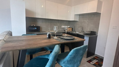 The apartment features a bright and inviting living room, a fully equipped kitchen, and two contemporary bathrooms—a rare convenience for a one-bedroom layout. Large windows allow abundant natural light and offer pleasant neighborhood views, enhancing the overall sense of space and comfort.