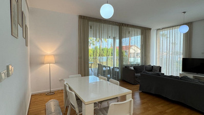 Inside, you will find three spacious bedrooms and a contemporary bathroom. The home is fully furnished with tasteful décor, ensuring a move-in ready experience. A central air conditioning system and underfloor heating provide comfort year-round.