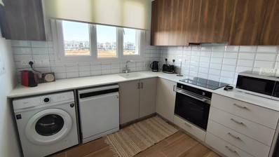 The apartment offers an open-plan kitchen and living area, designed for modern day living. The kitchen comes fully equipped with all white goods, including a dishwasher, while air-conditioning units are installed in all rooms for year-round comfort.