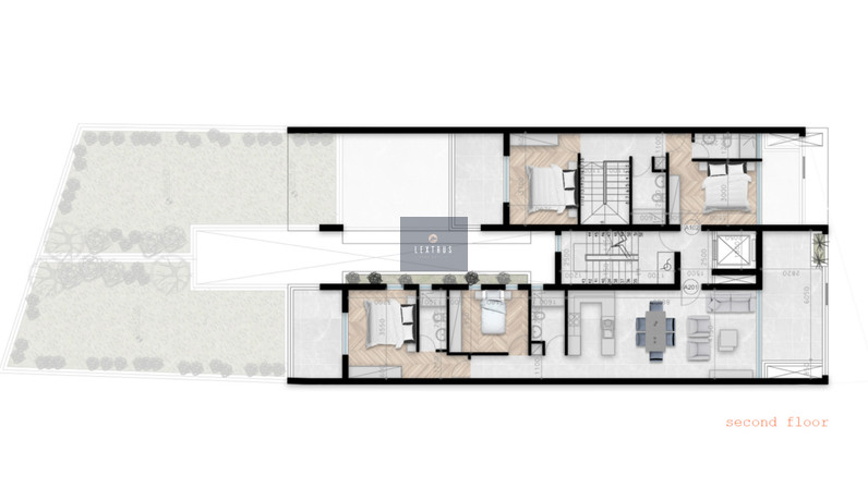 By combining the two first-floor+second floor apartments, Units 101 and 201, this exceptional duplex residence offers an impressive 184m² of net internal area, together with 58m² of covered verandas, 20m² of common areas, and a very spacious 63m² private garden at the rear of the building.
