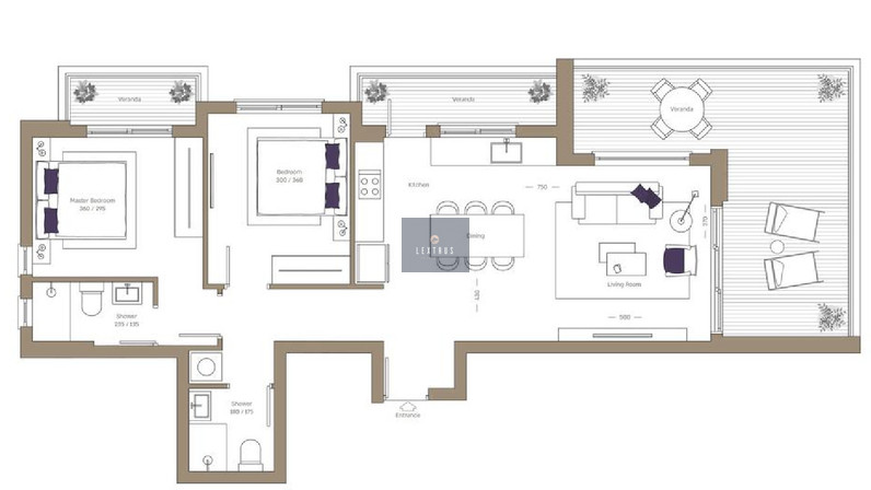 The apartment features two spacious bedrooms and two contemporary bathrooms, designed for both privacy and convenience. Large windows fill the living spaces with natural light, creating a bright and inviting atmosphere. The layout is open and functional, allowing you to easily arrange your personal style.
