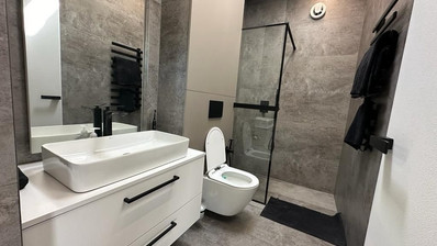 Rain shower, wall hung toilet, no threshold shower, glass partition. Draft plumbing - Rehau system. Water leakage sensor.